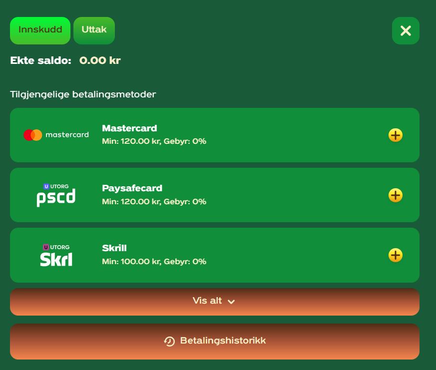 Alle innskuddsmetoder er øyeblikkelige, og minimumsinnskuddet er 100 kr. Det er ingen gebyrer som brukes av GreenLuck for innkommende transaksjoner.